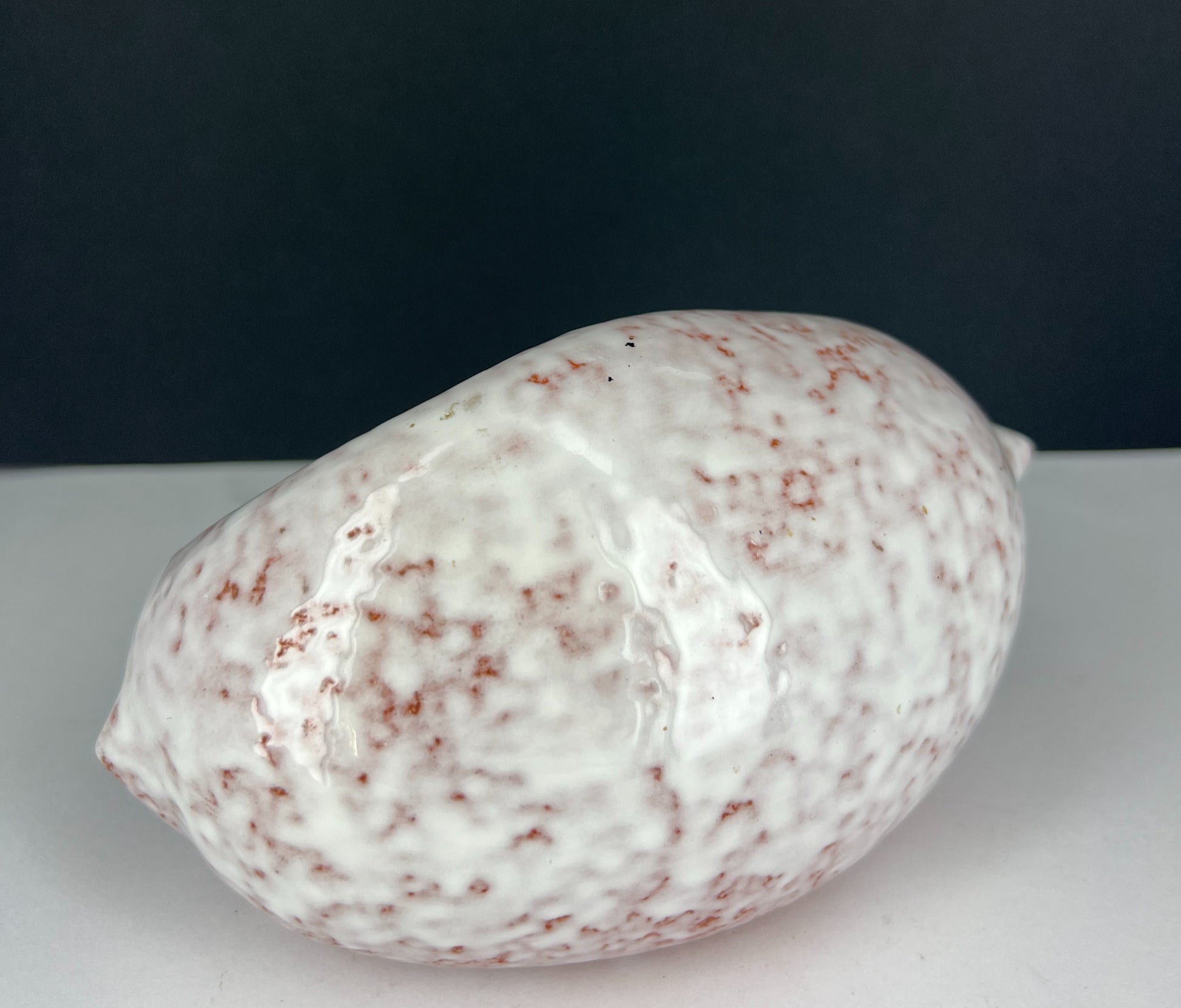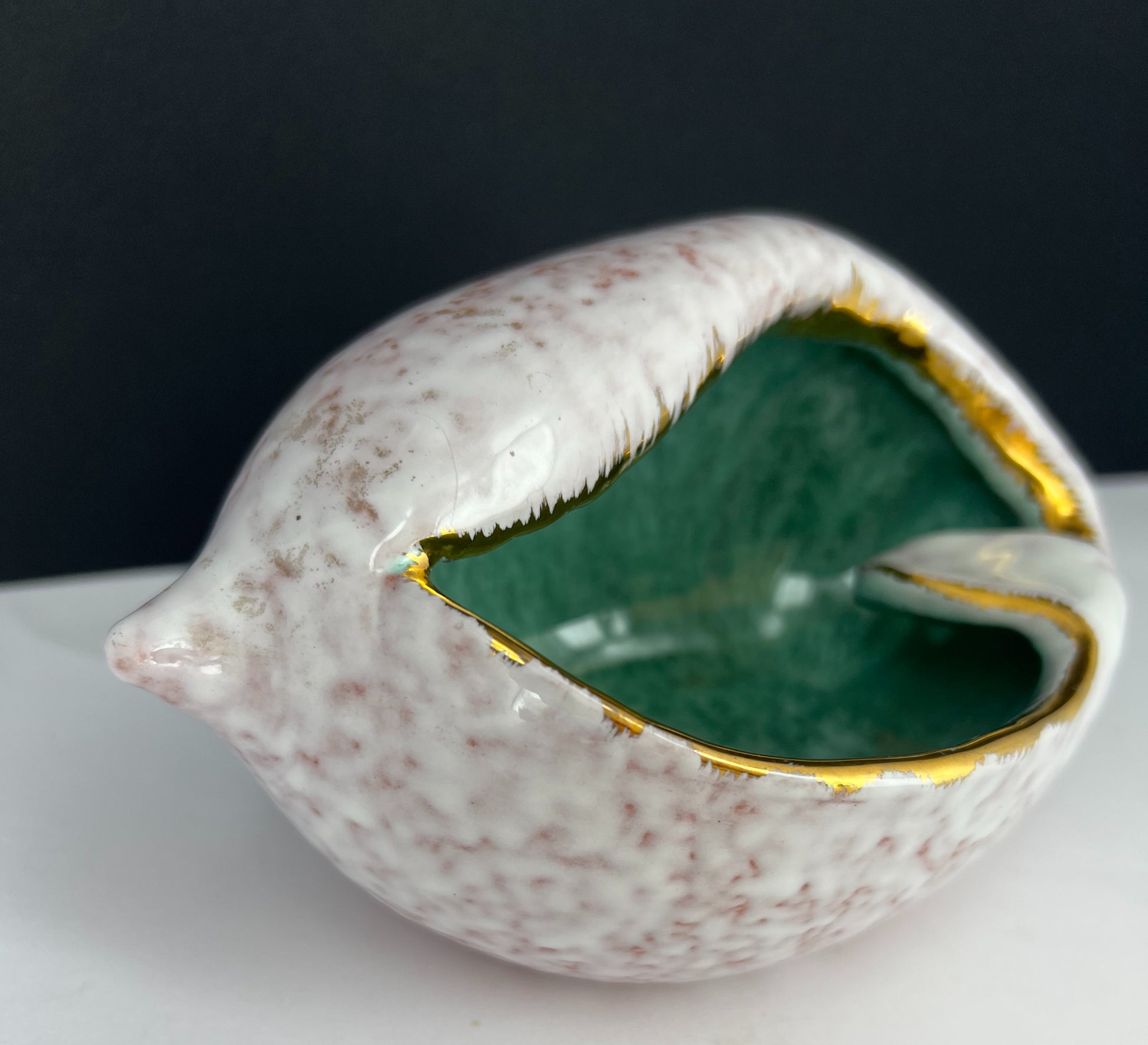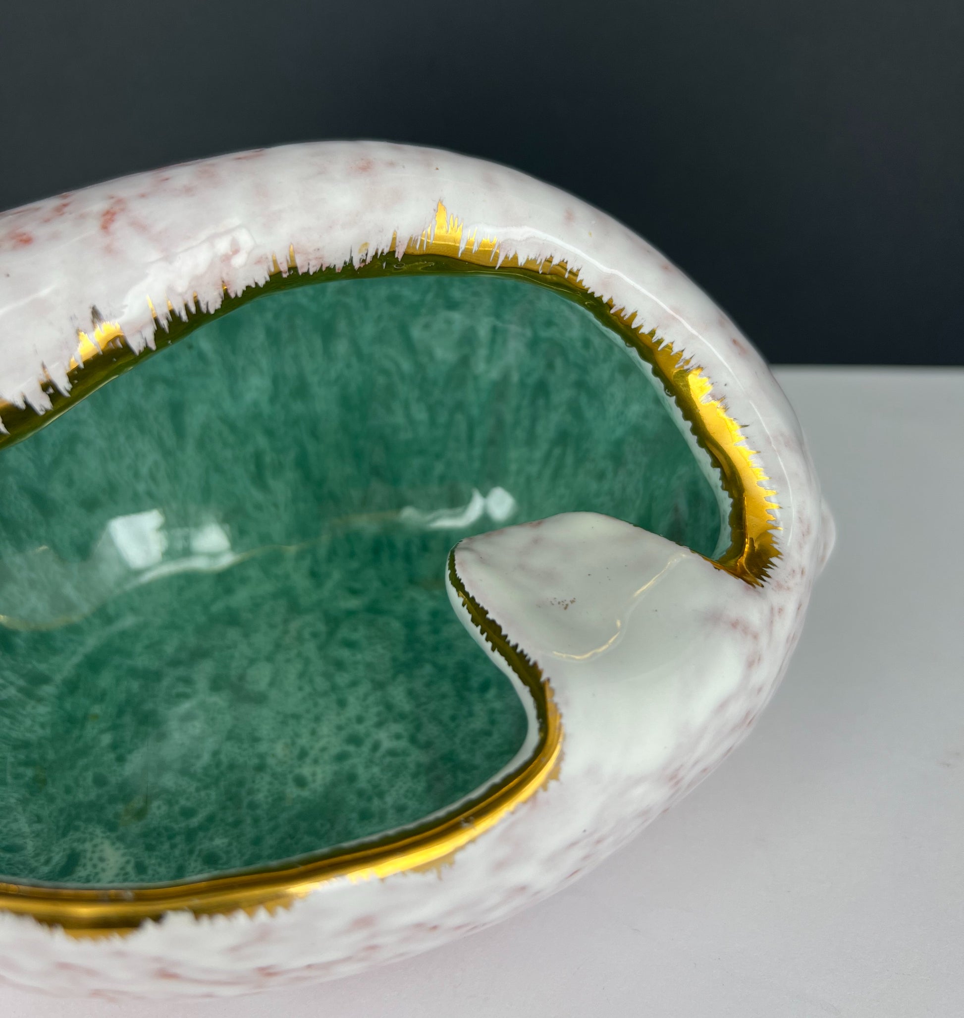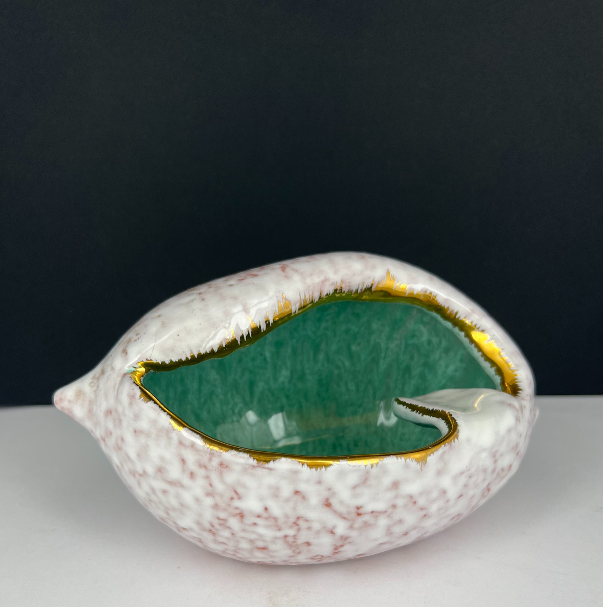 Vide poche en forme de coquillage en céramique émaillée écume à fond bleu et liseré doré