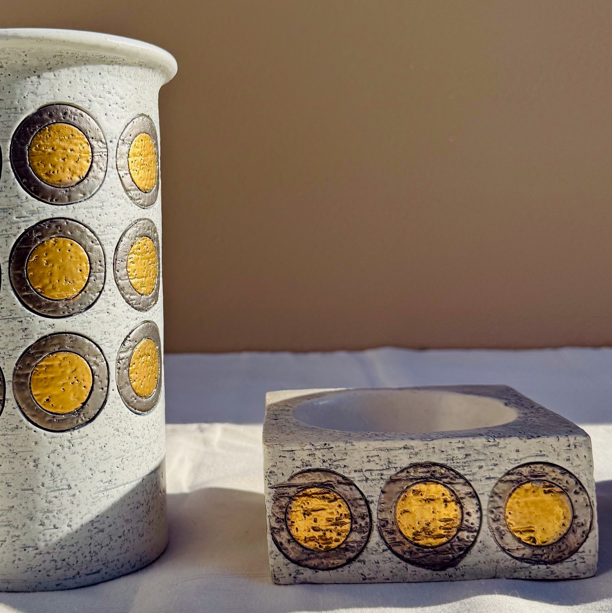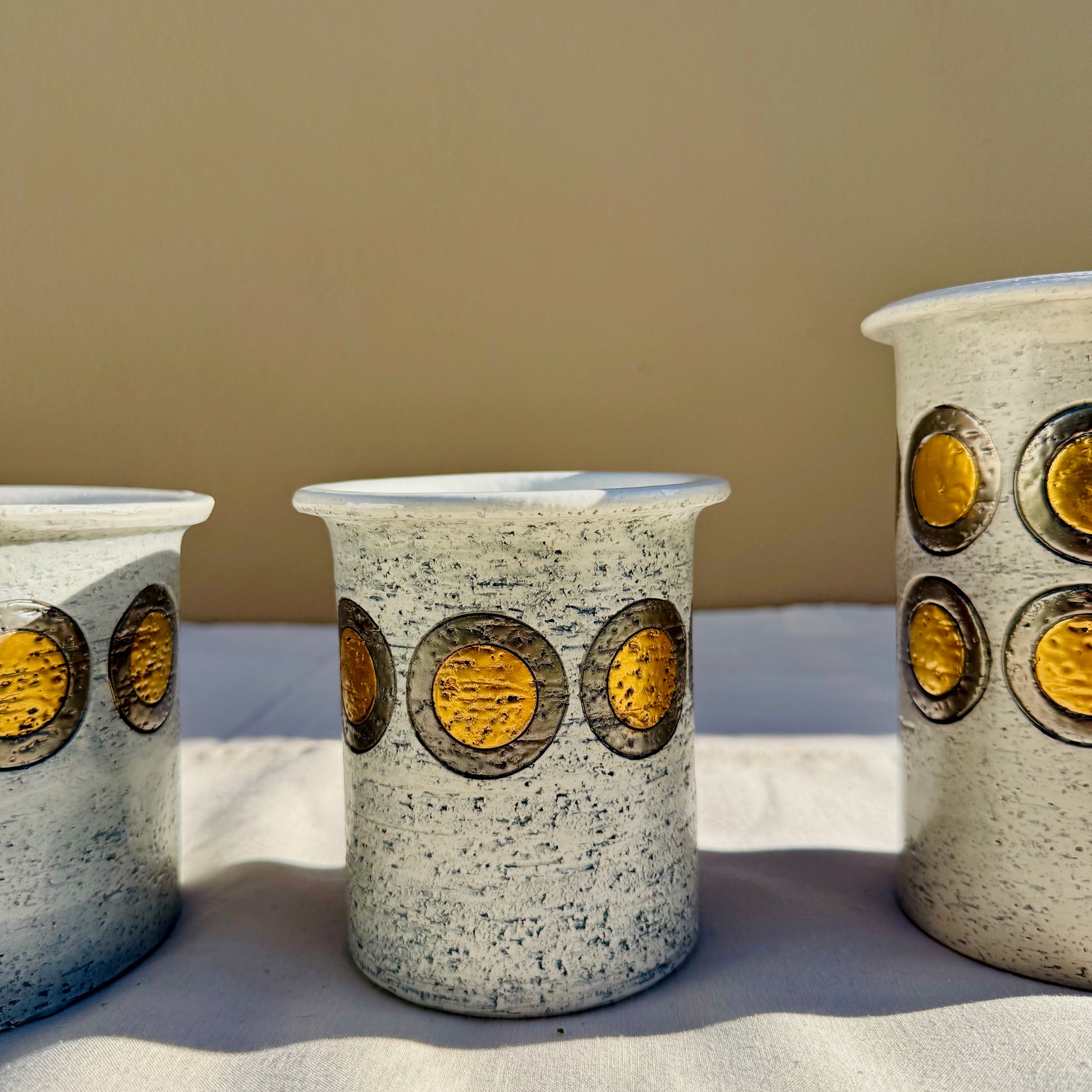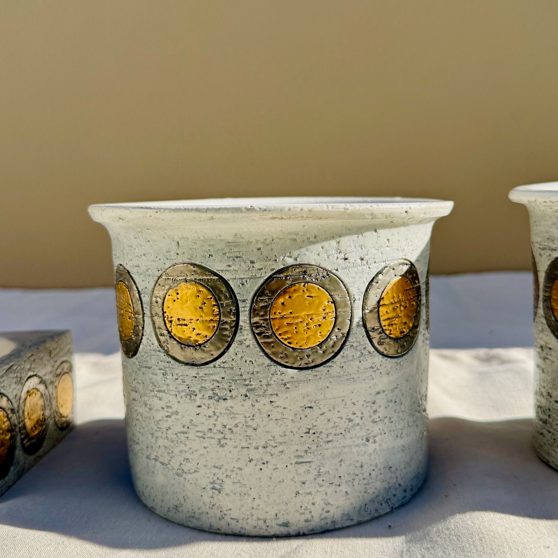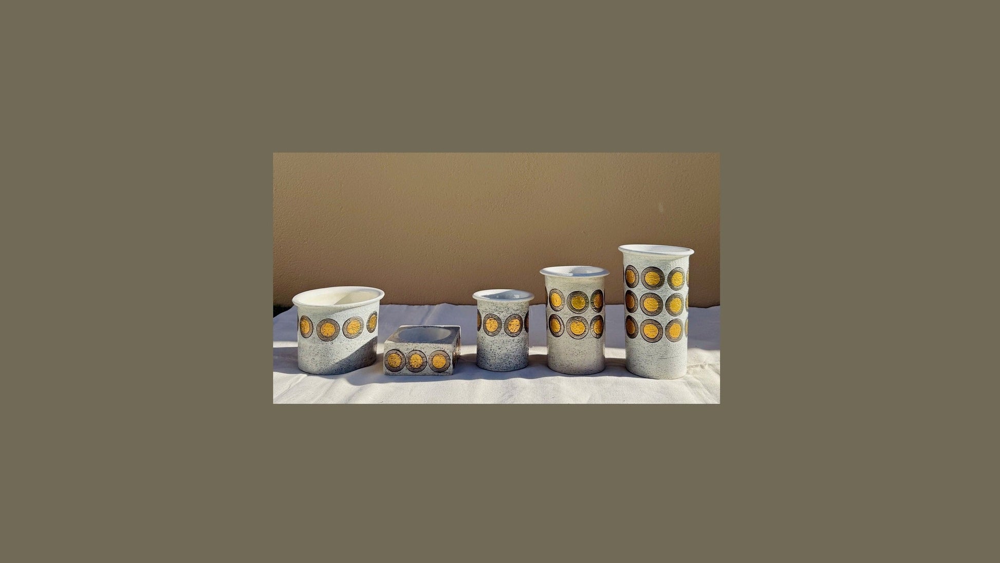 Incroyable réunion de quatre vases rouleaux et d'un vide poche en céramique émaillée à décors de frises de cercles concentriques argentées et dorées sur fond blanc gris nuancé