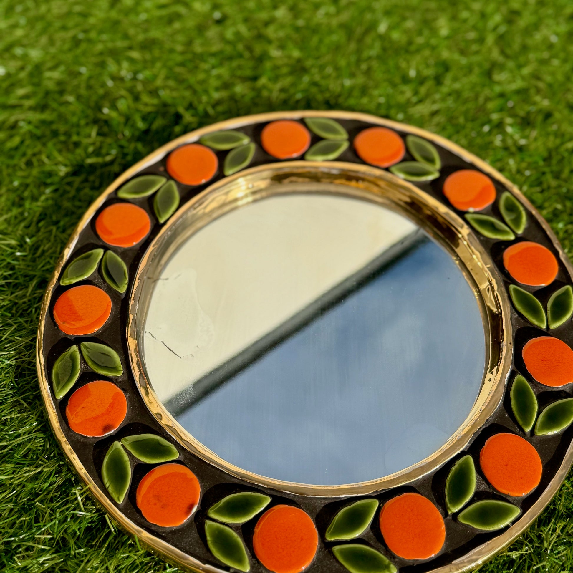 Miroir rond en céramique émaillée de Mithé Espelt à décor d'oranges à feuilles vertes sur fond noir et or