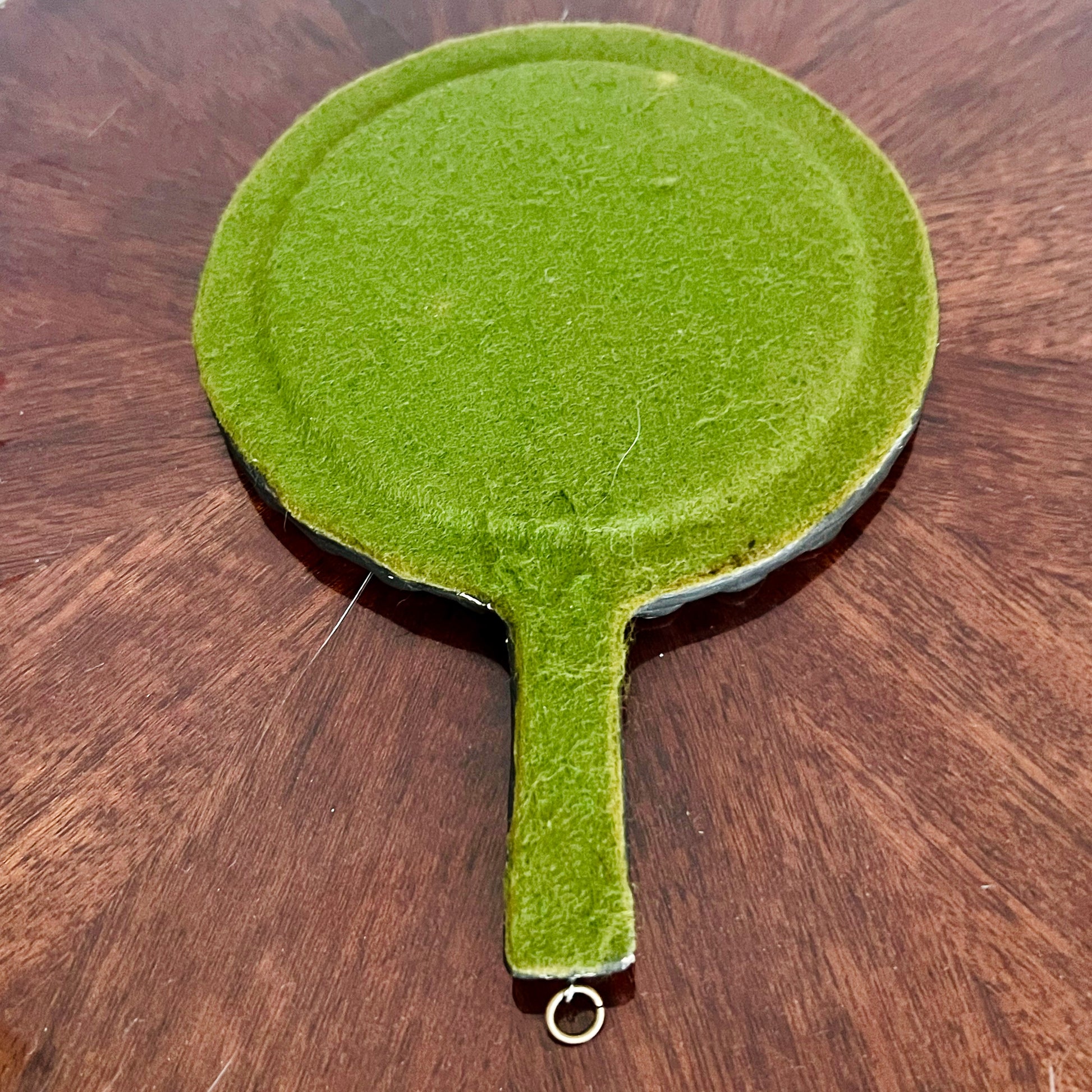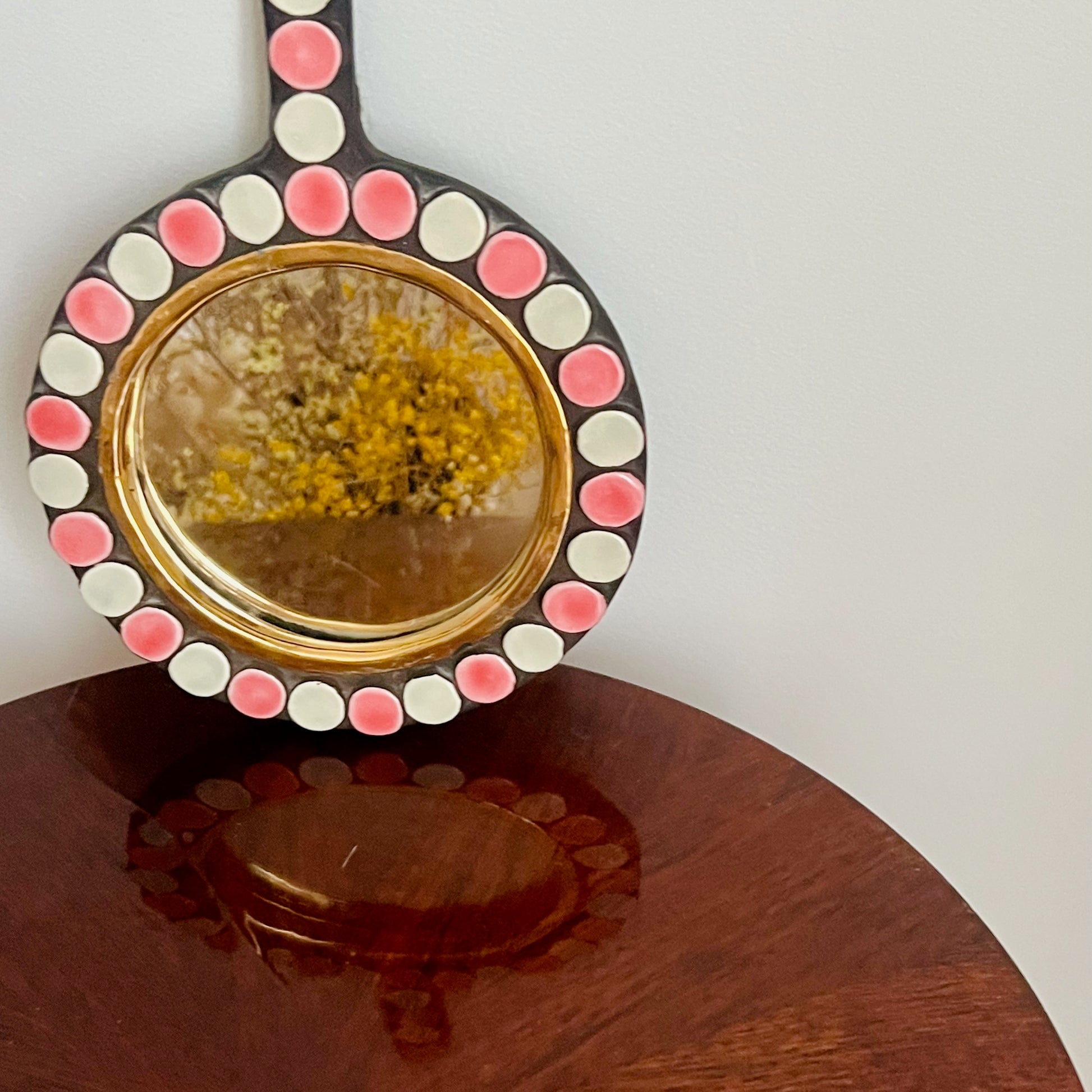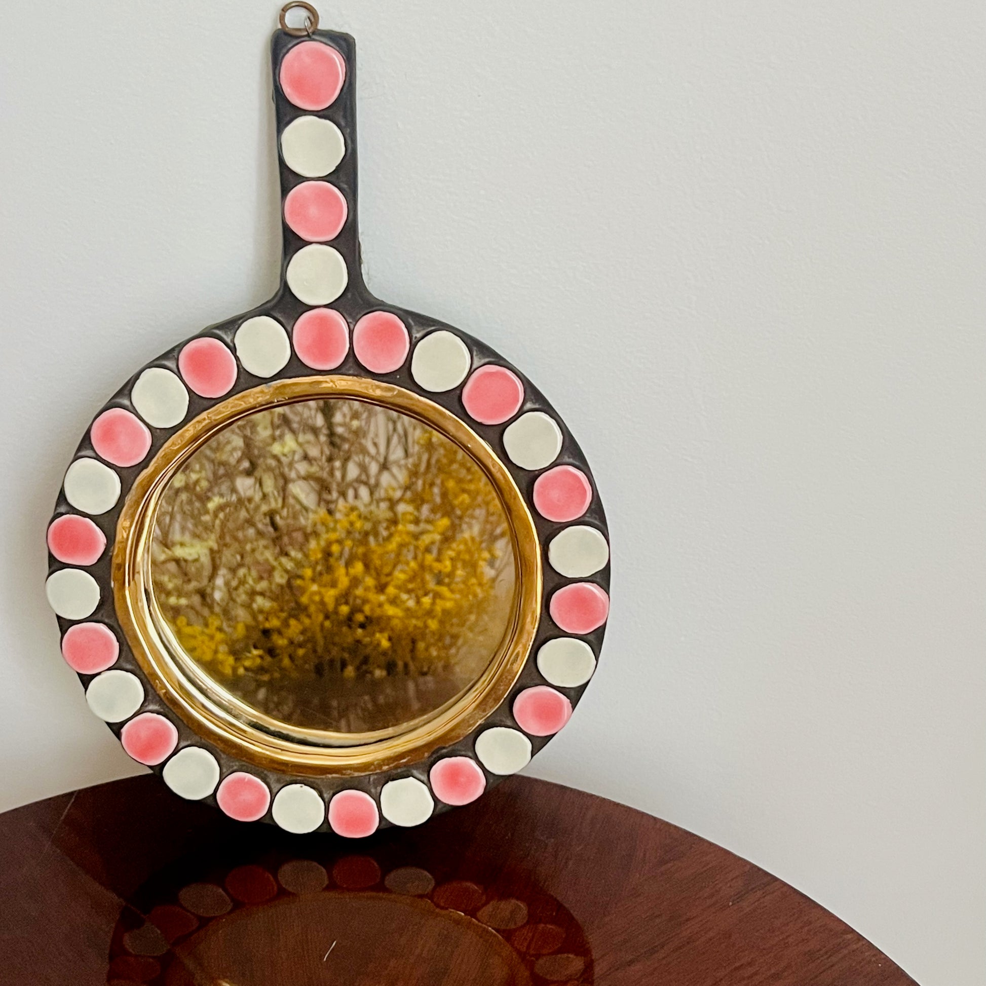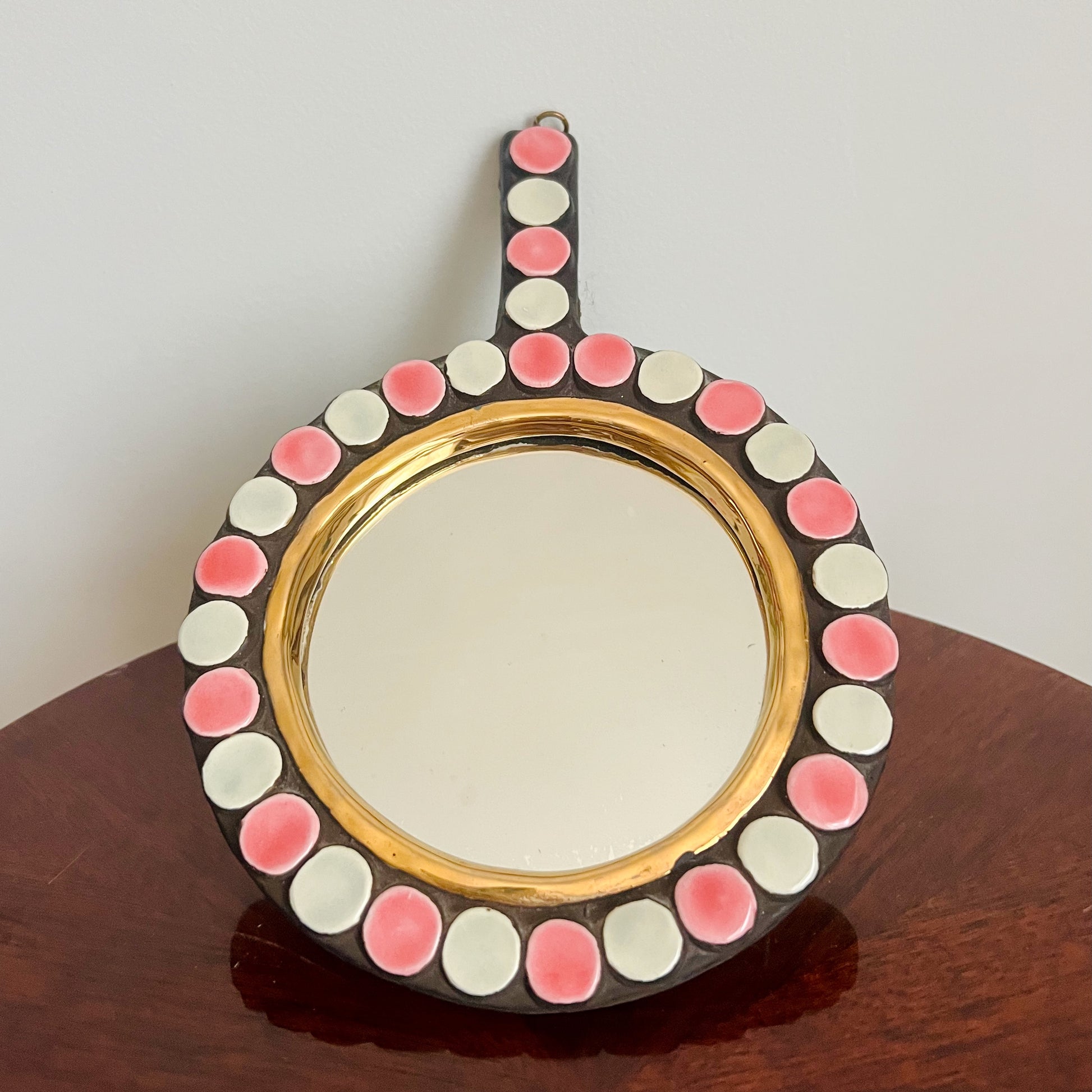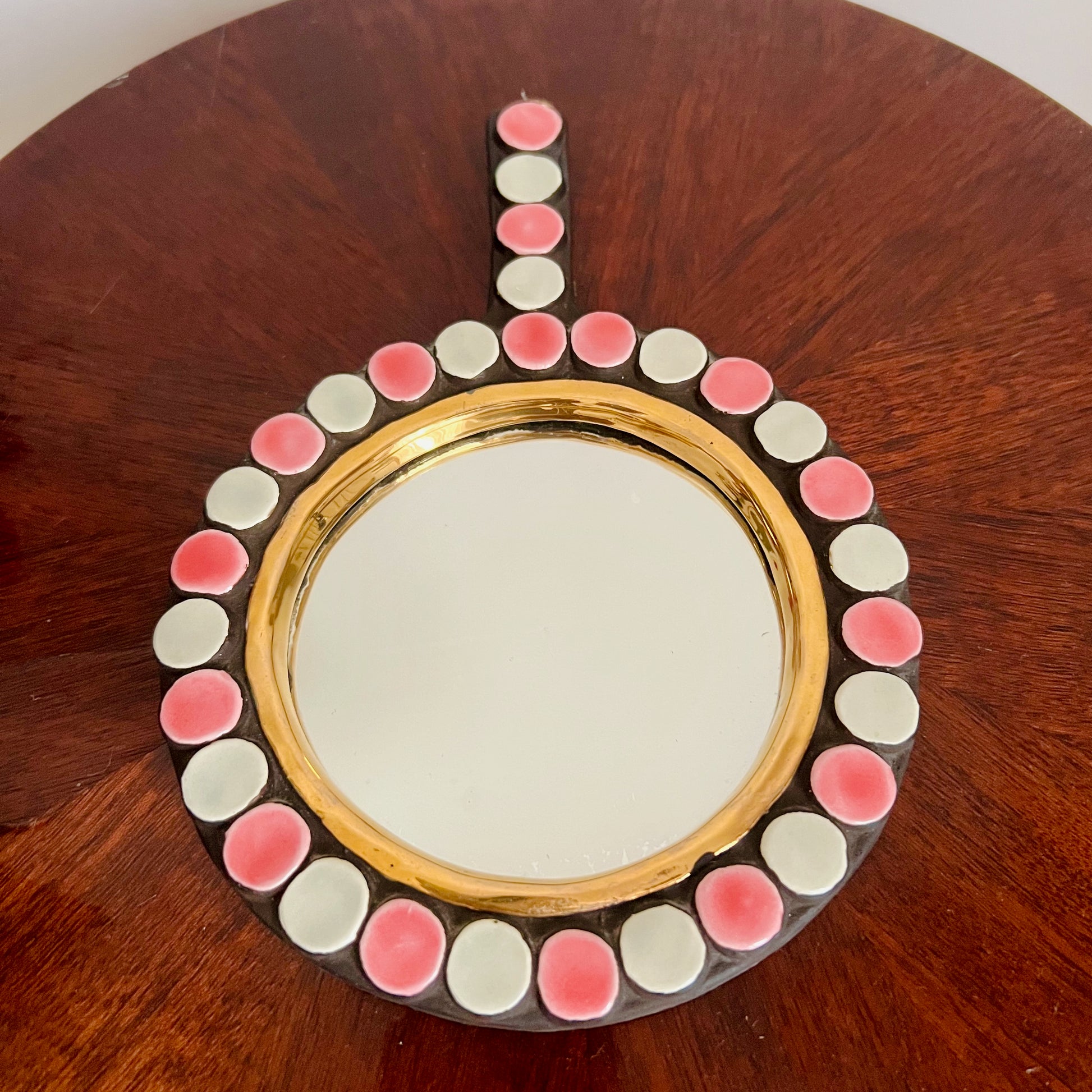 Très joli et doux miroir face à main en faïence polychrome à décor en relief de pastilles roses et blanches sur le pourtour