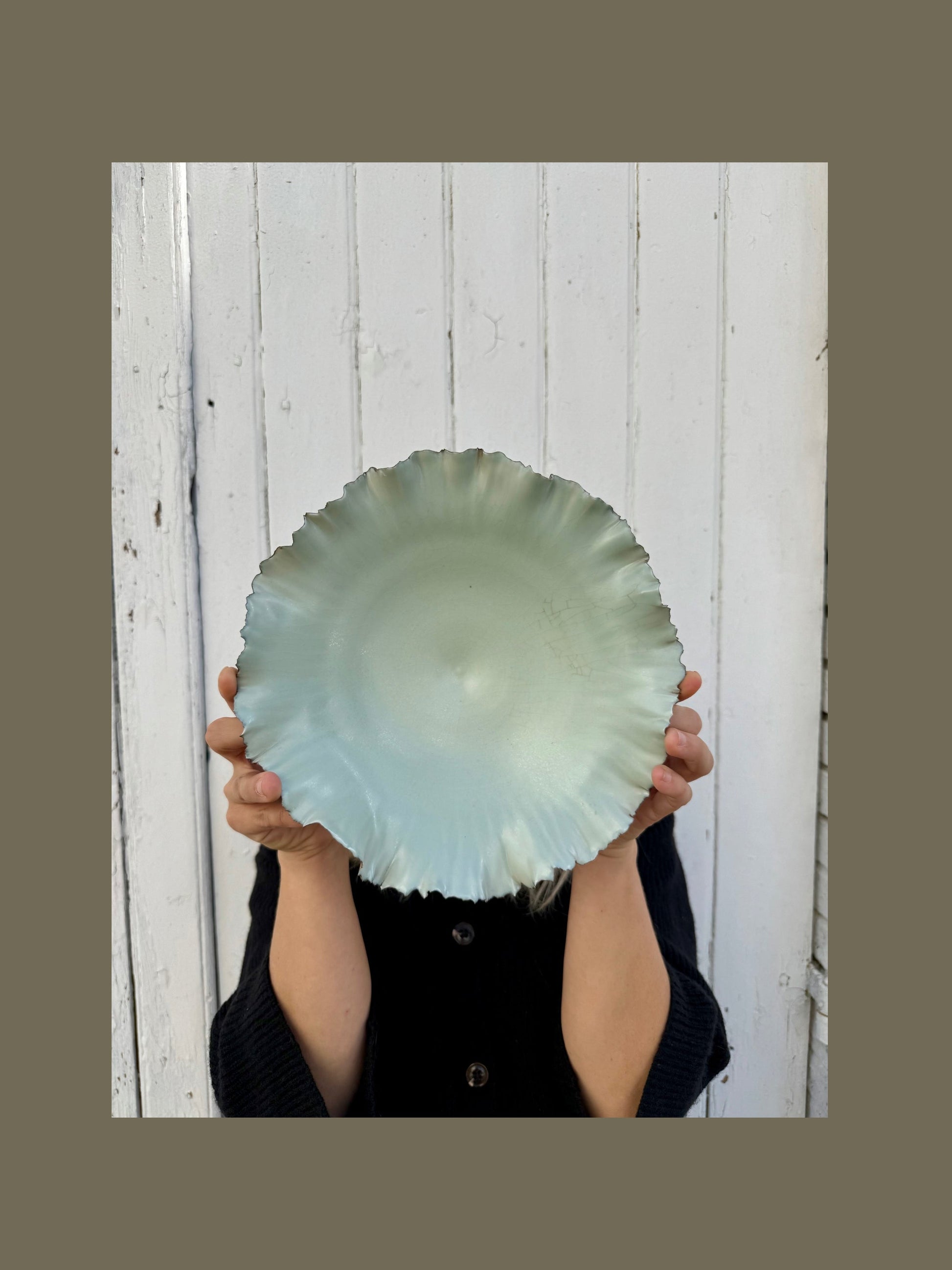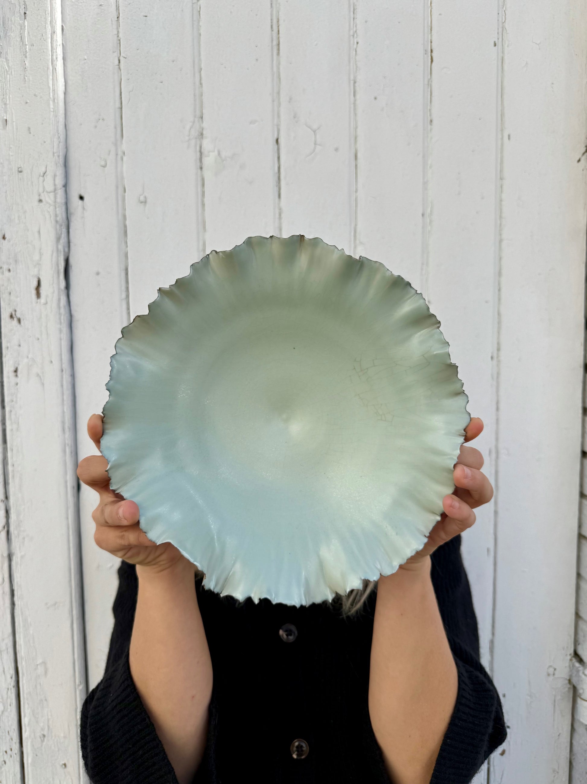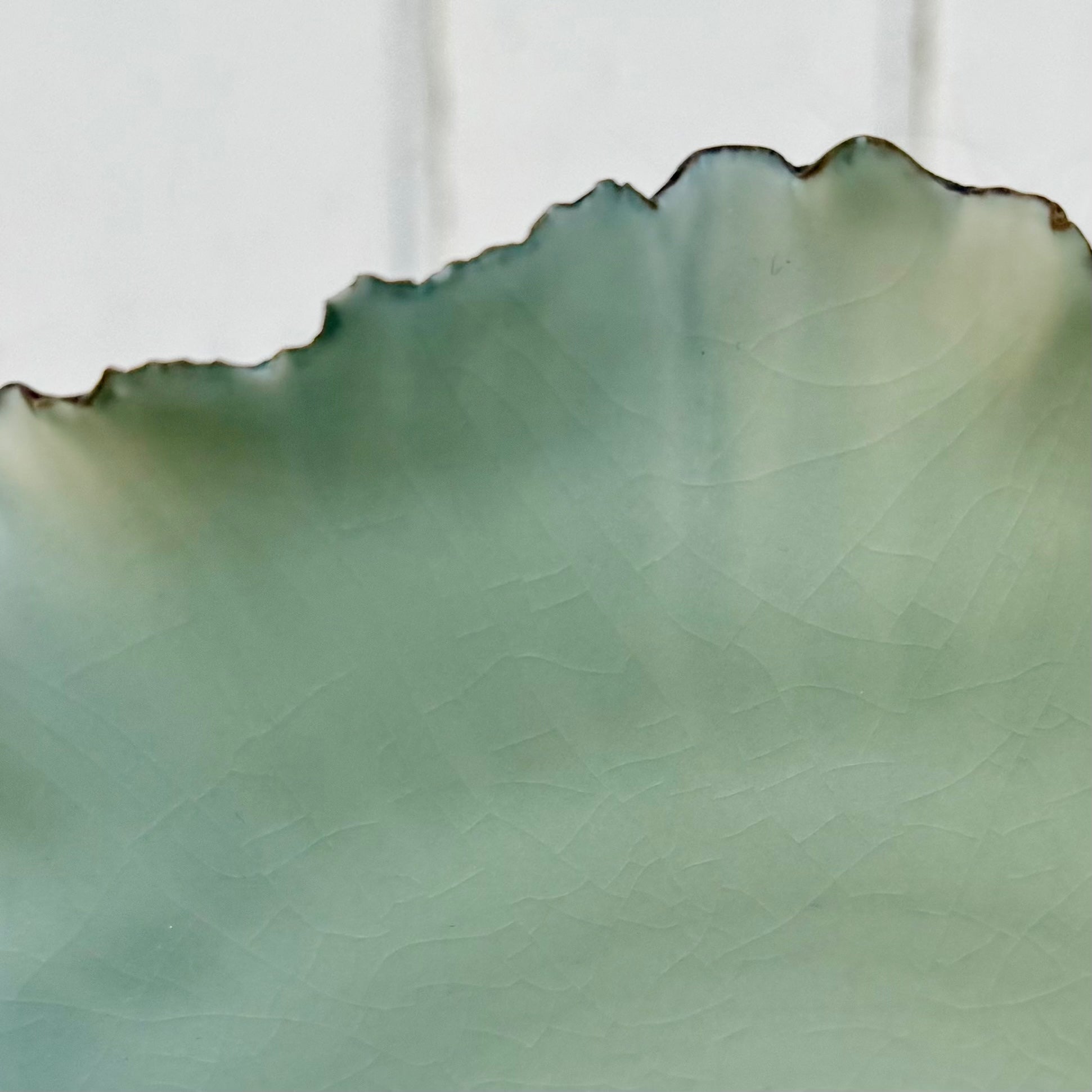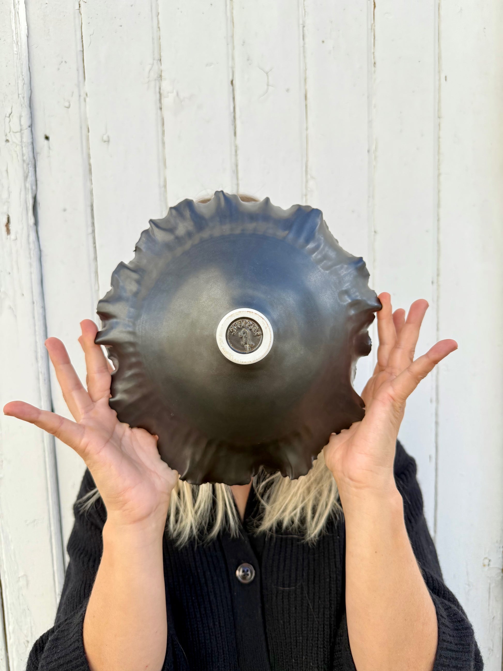 Incroyable coupe en porcelaine émaillée bleu clair à l'intérieur et noir à l'extérieur en forme de corolle