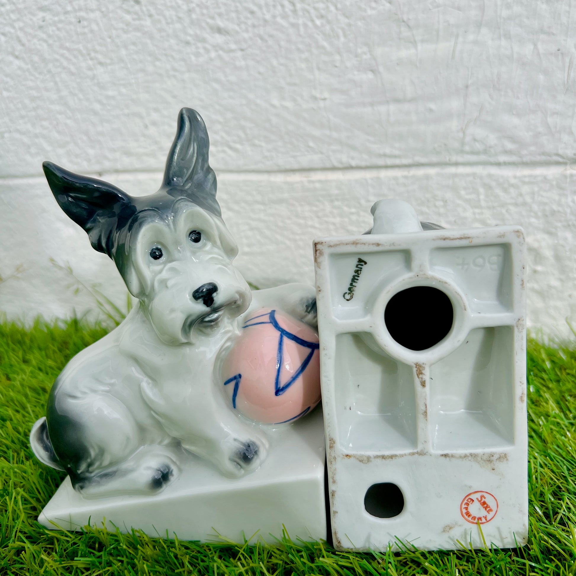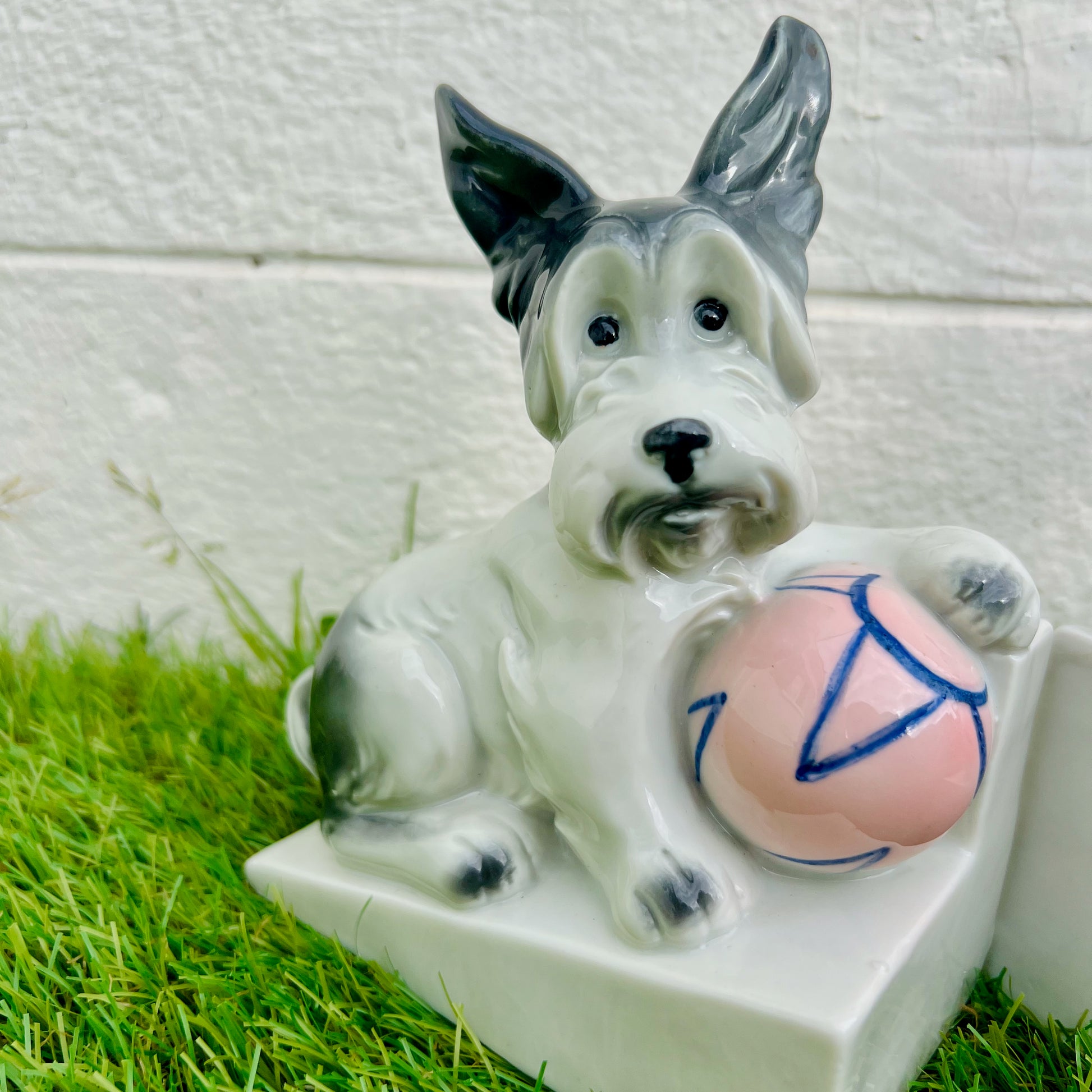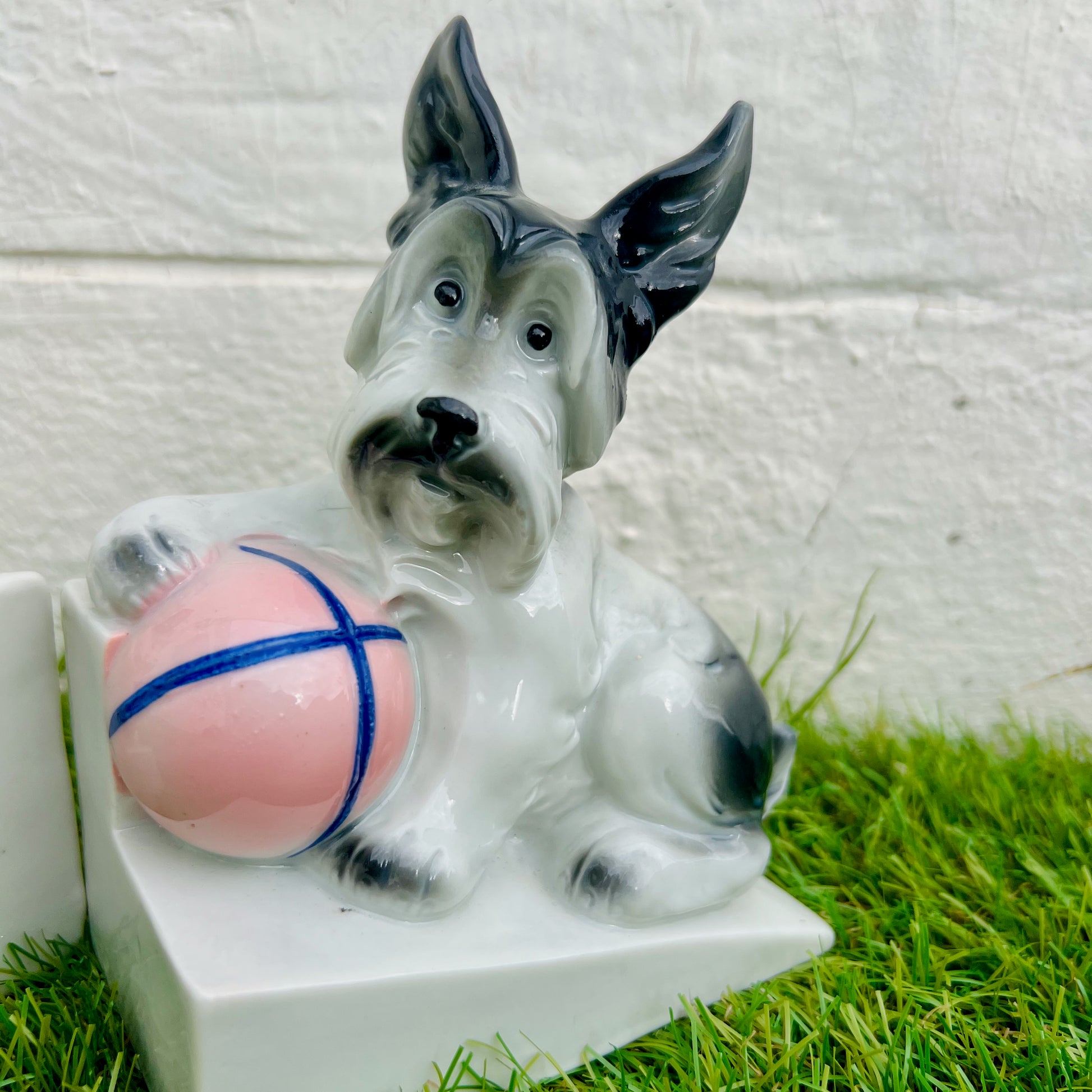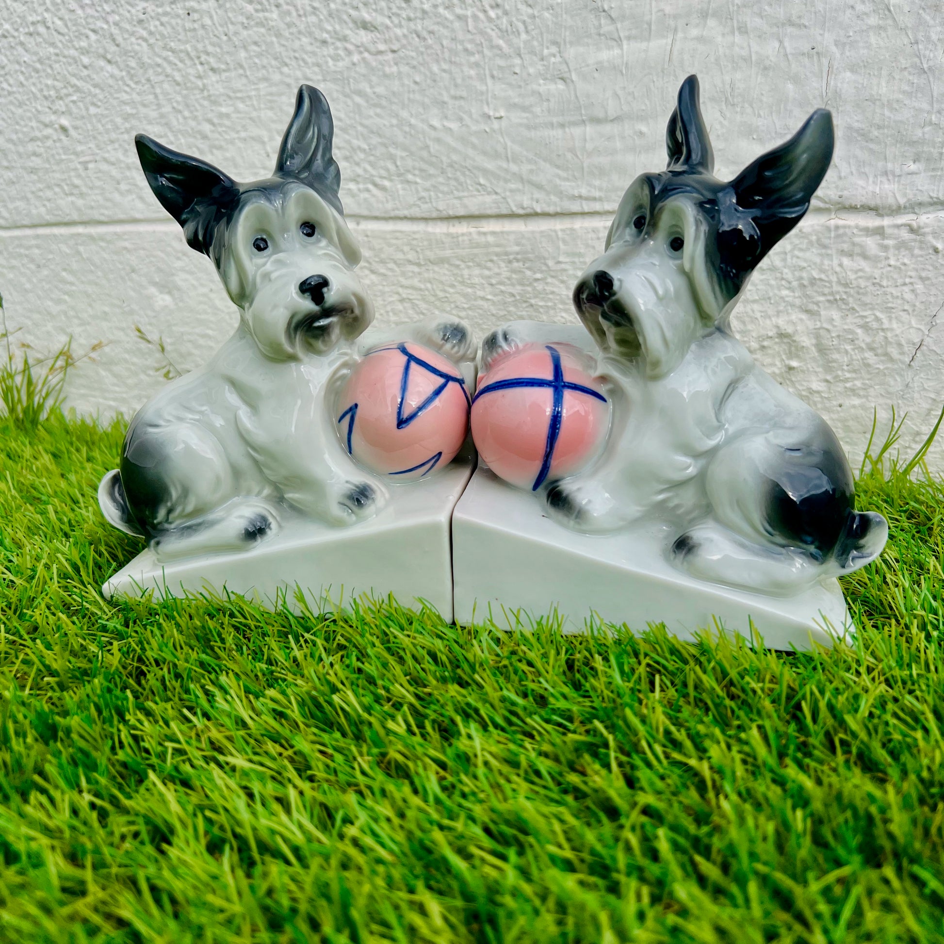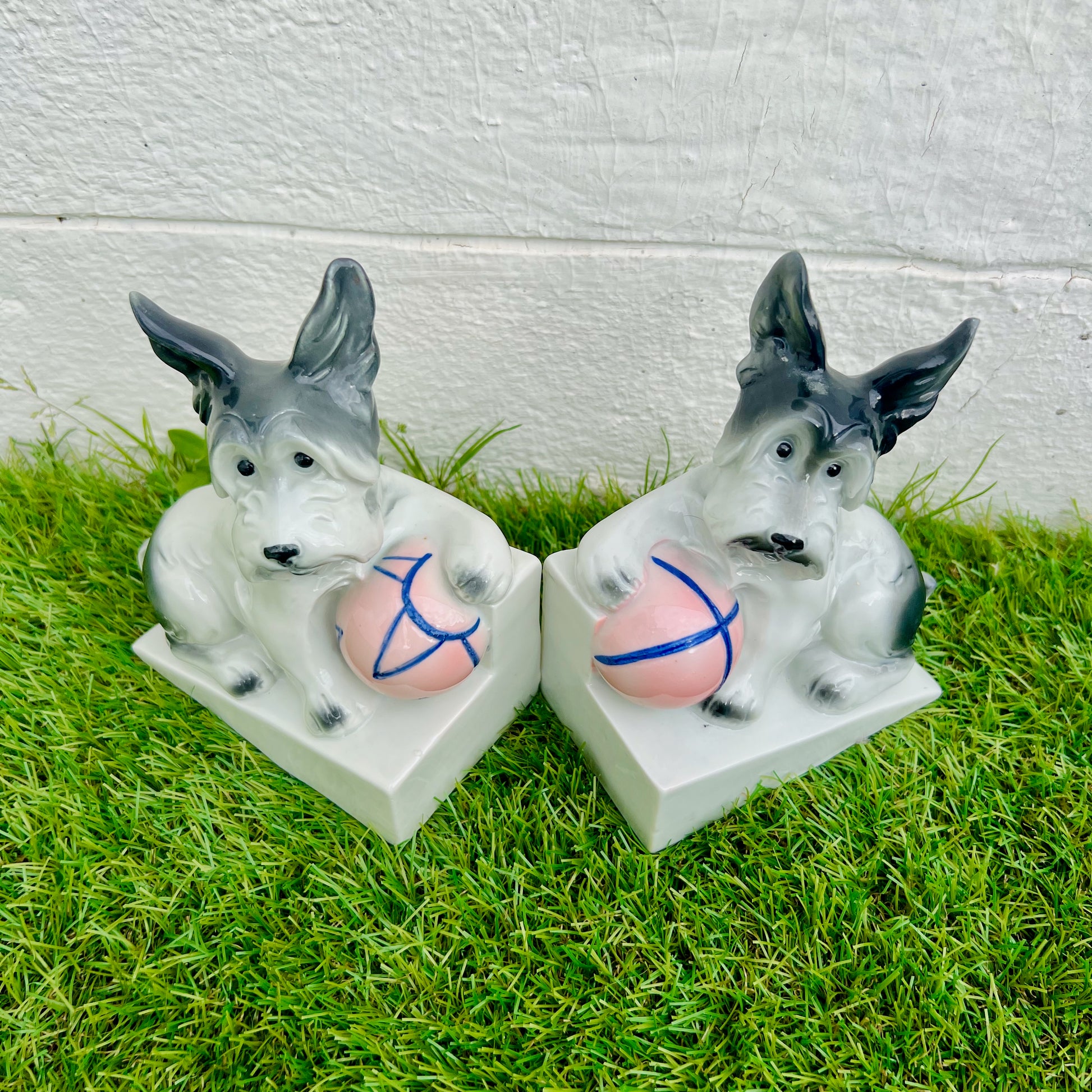 Paire de serre-livres Art déco en porcelaine de SAXE figurant des scottish terriers, la patte avant retenant une balle rose