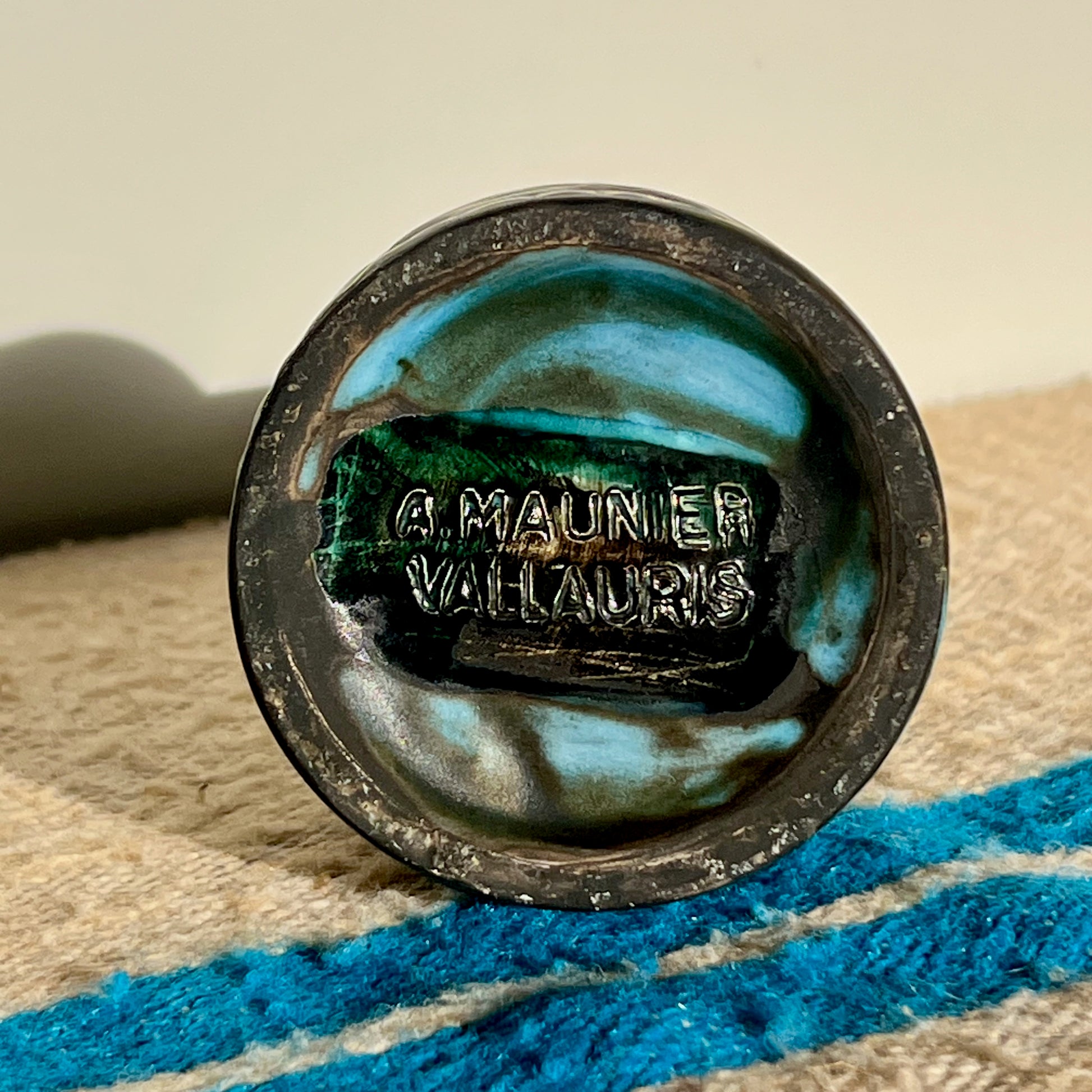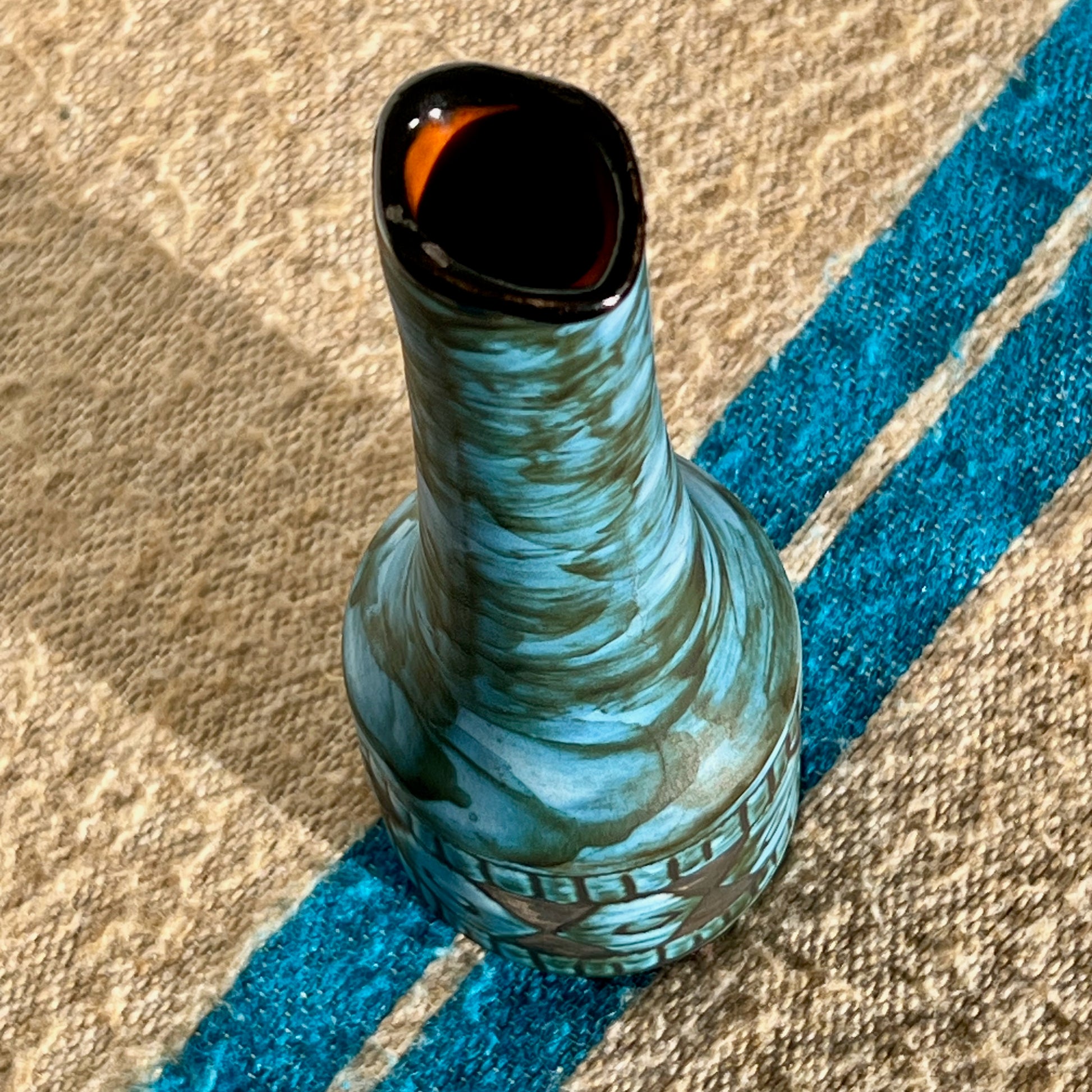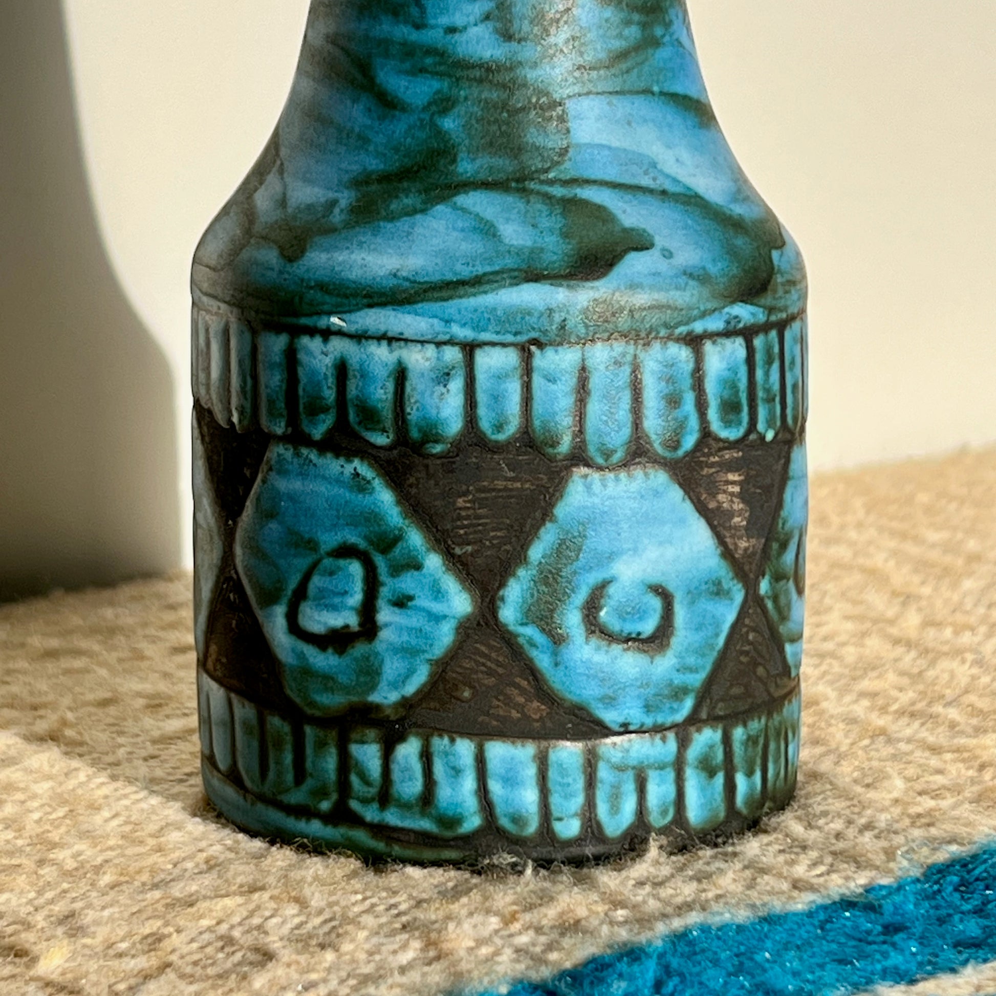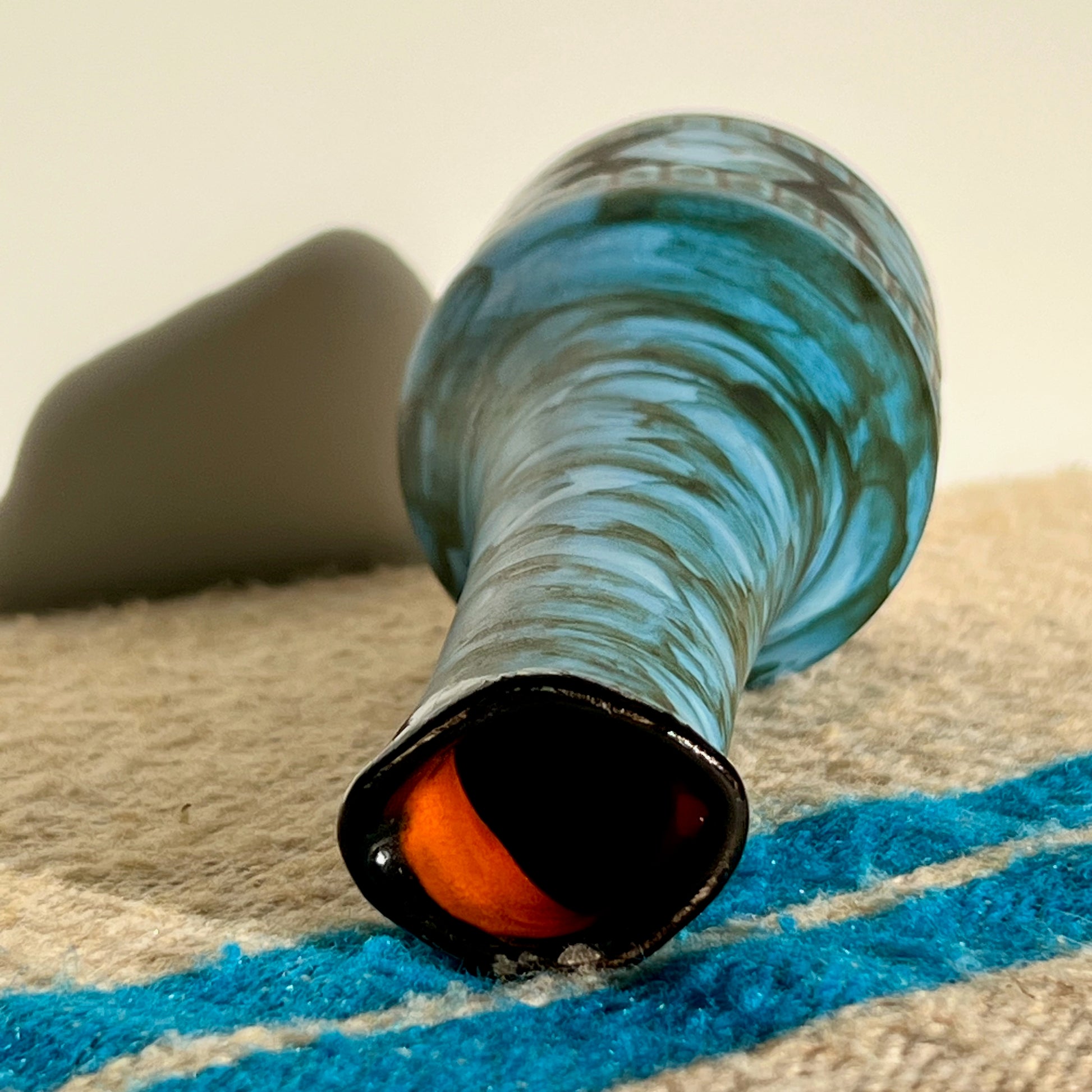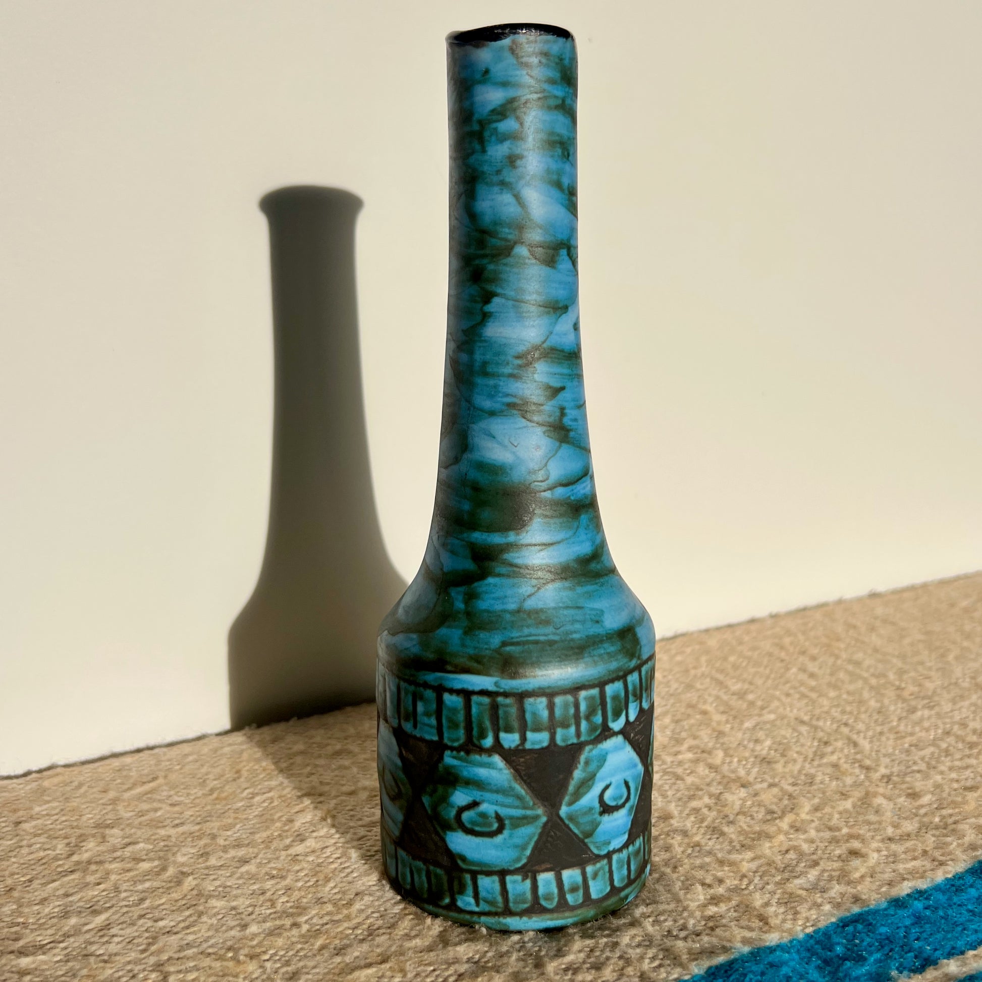 Joli soliflore en céramique émaillée dans les tons bleus nuancés bruns à décor géométrique typique de l'artiste Alain Maunier