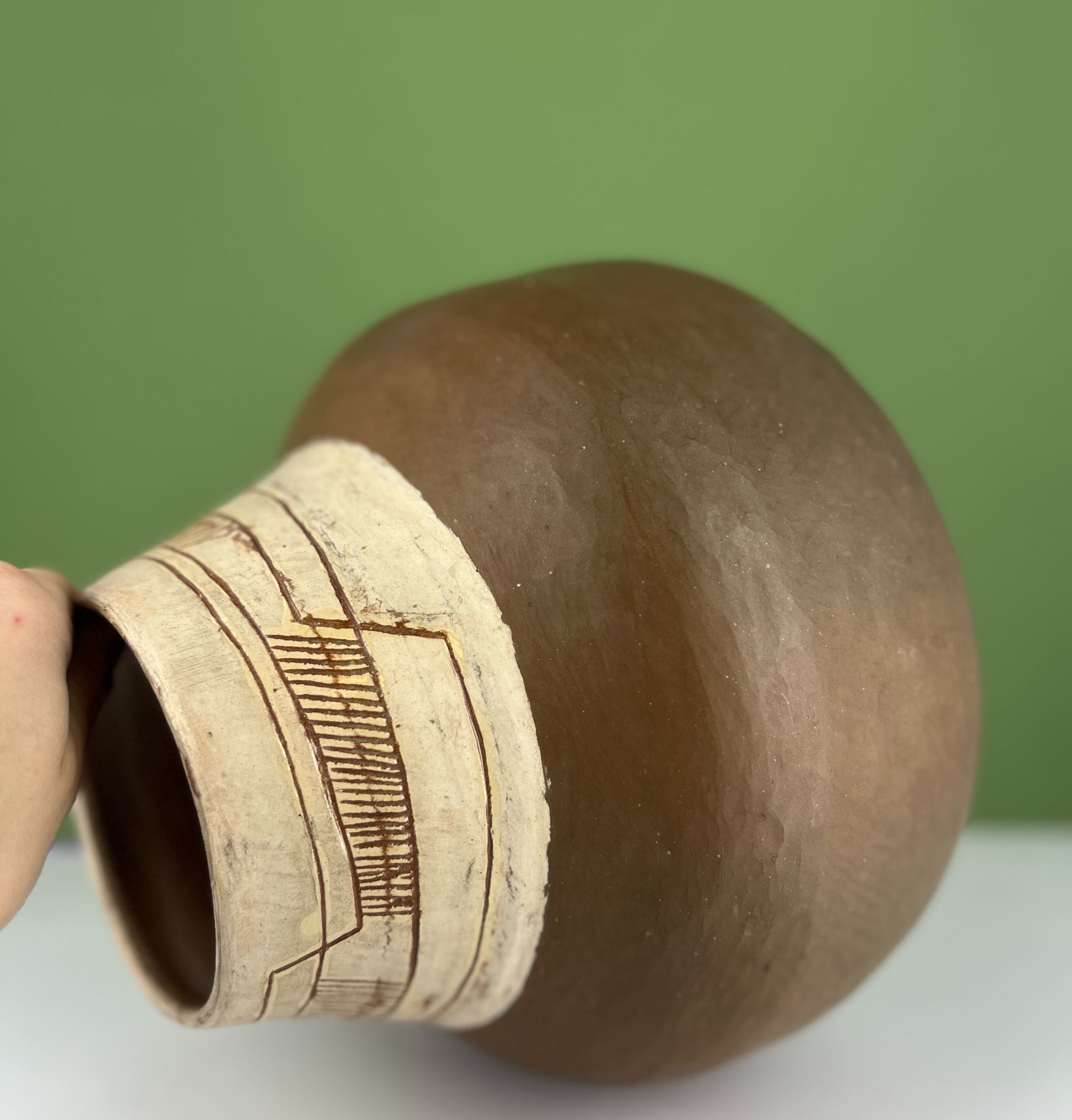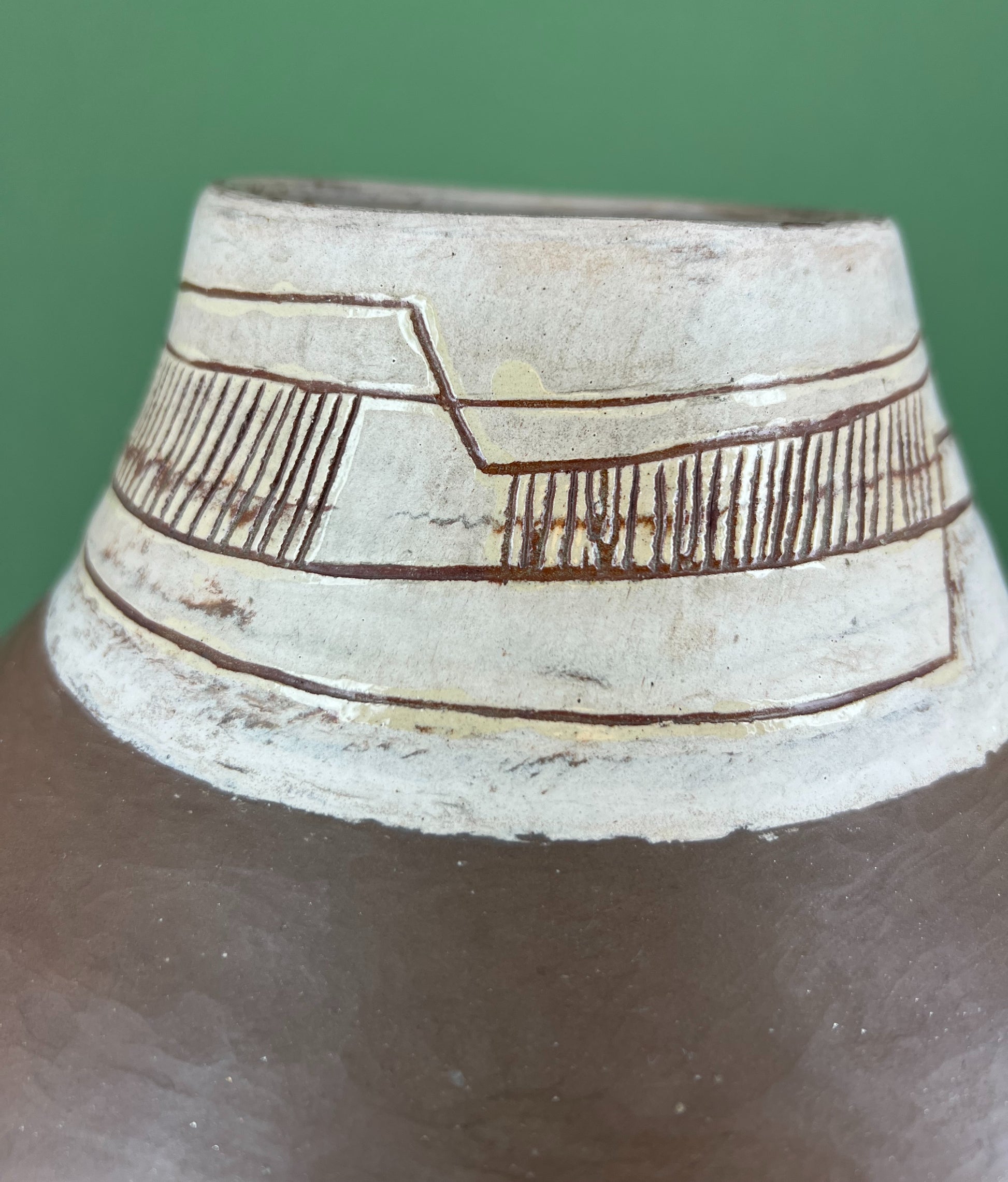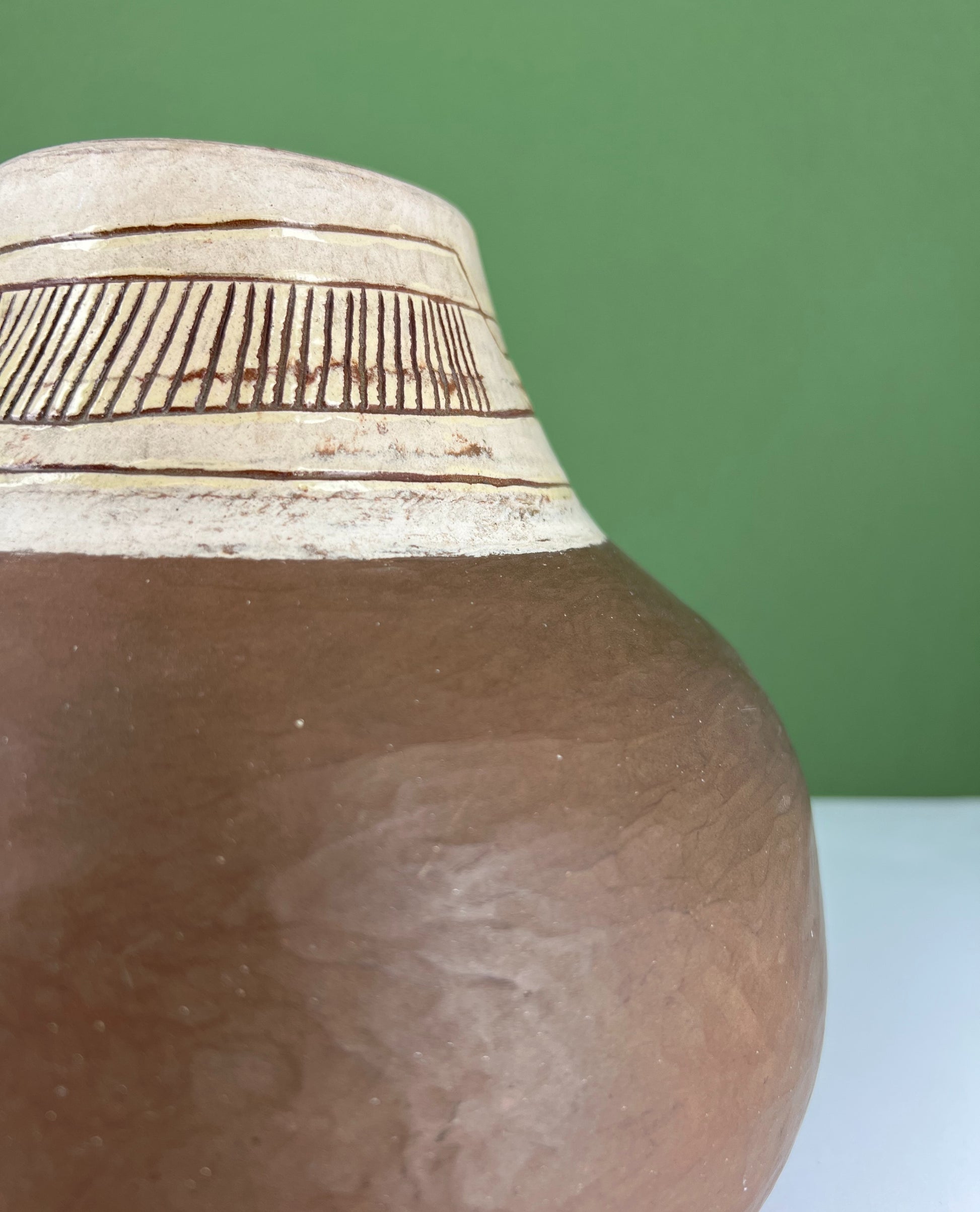 Magnifique Vase en céramique de terre rouge et col crème à décor