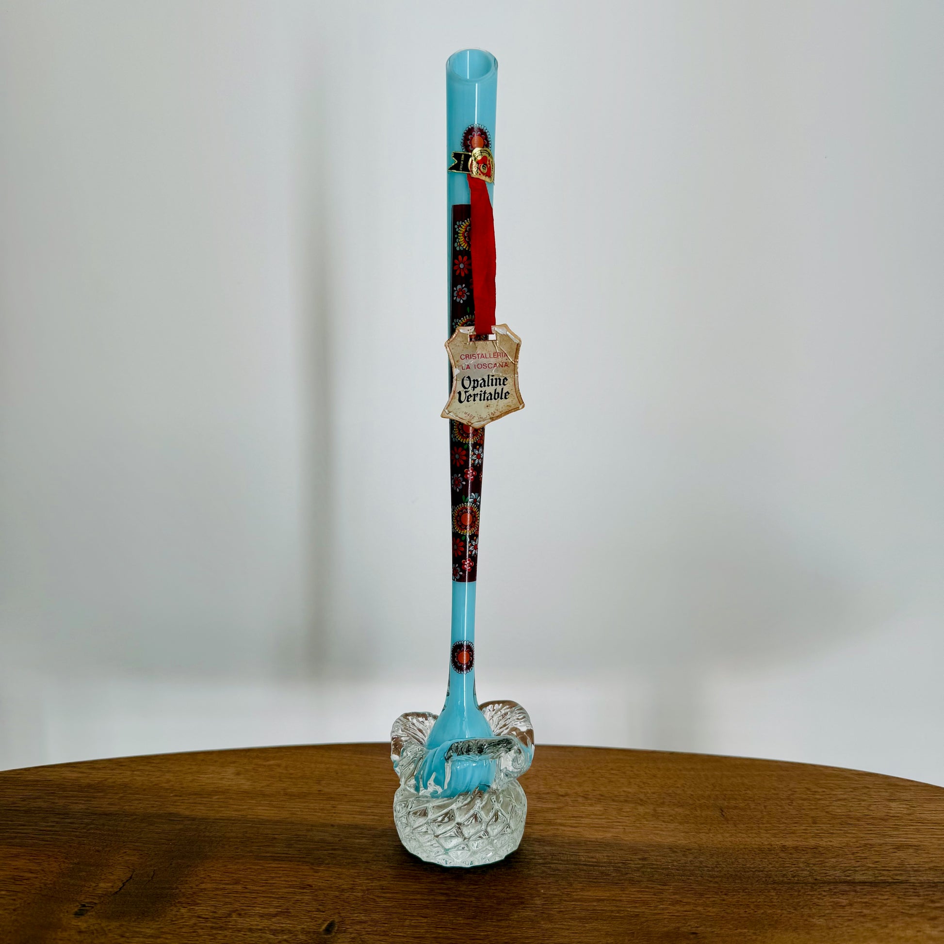 Il reste l'étiquette de provenance du vase de la cristallerie la toscane ainsi que Opaline véritable