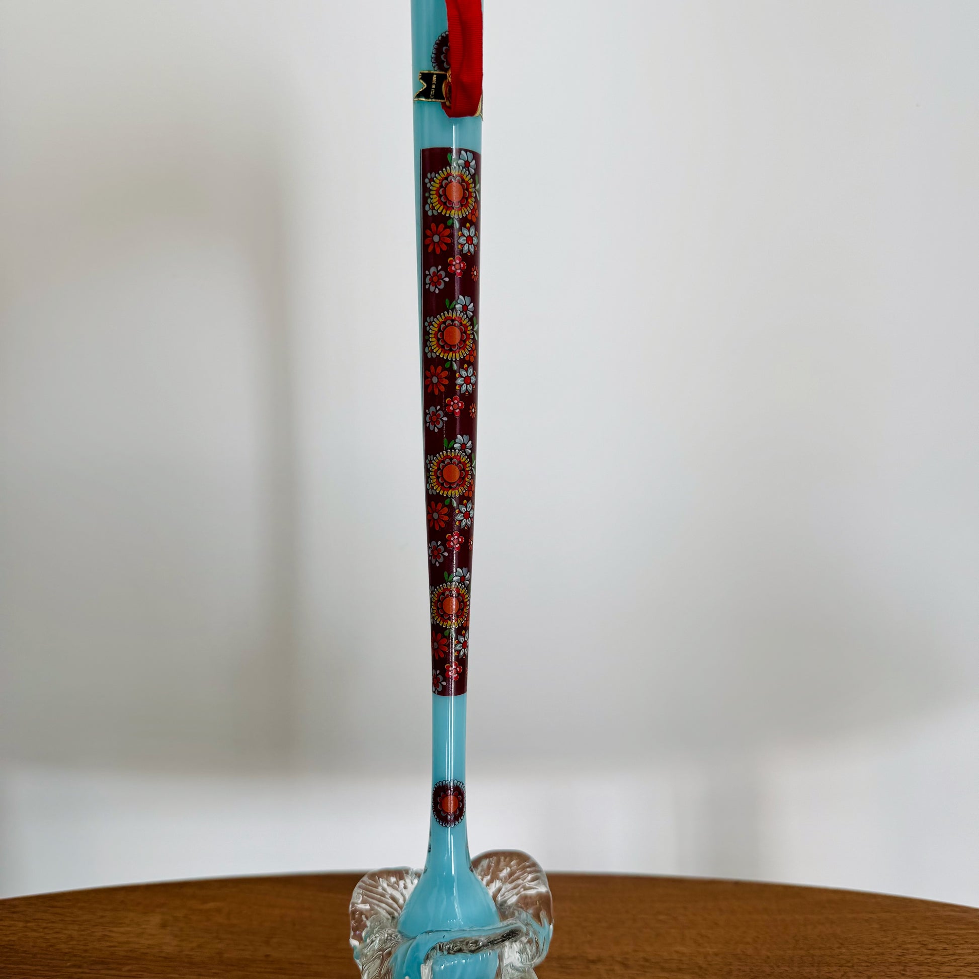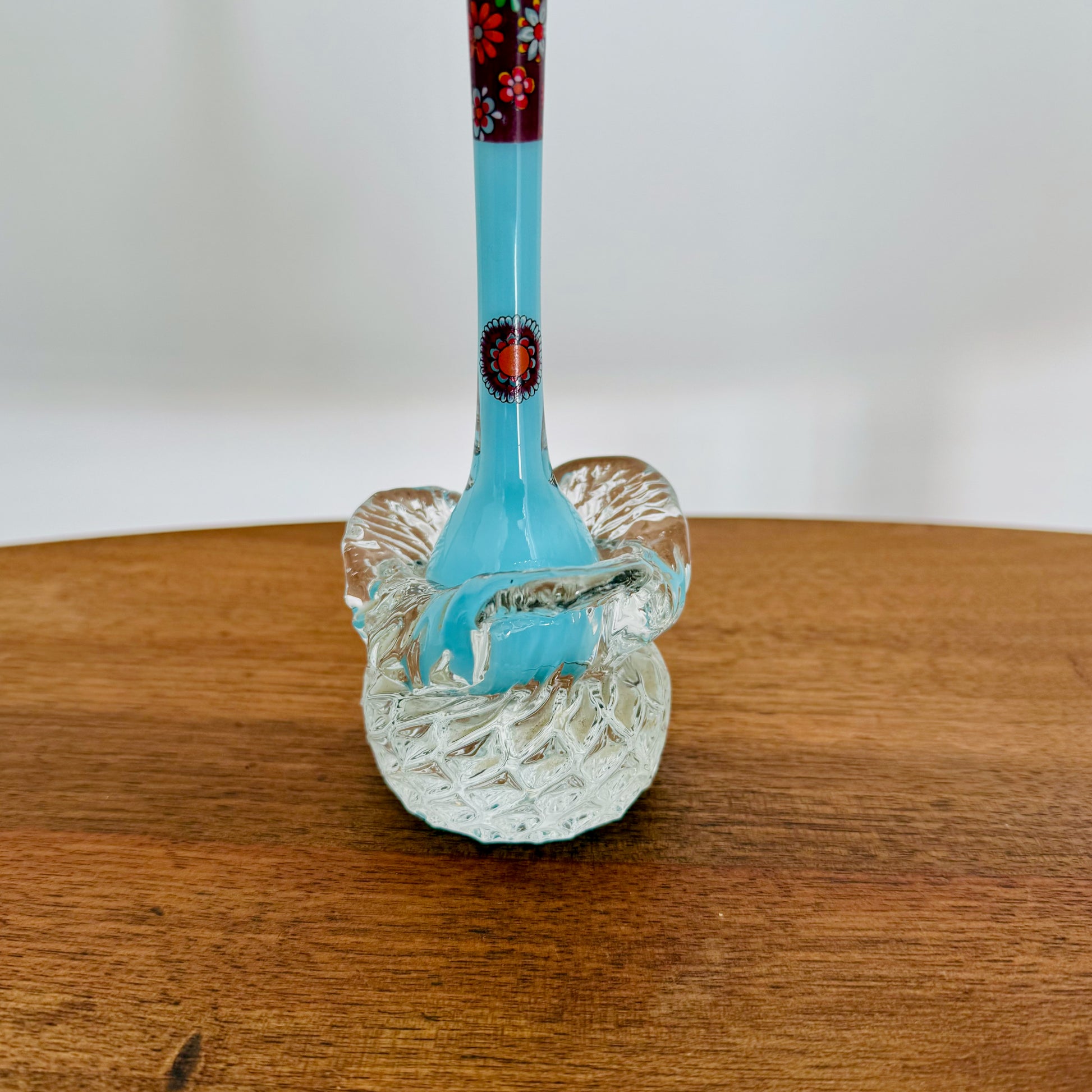 Joli soliflore en Opaline Bleu et décor de fleurs, socle en verre soufflé transparent
