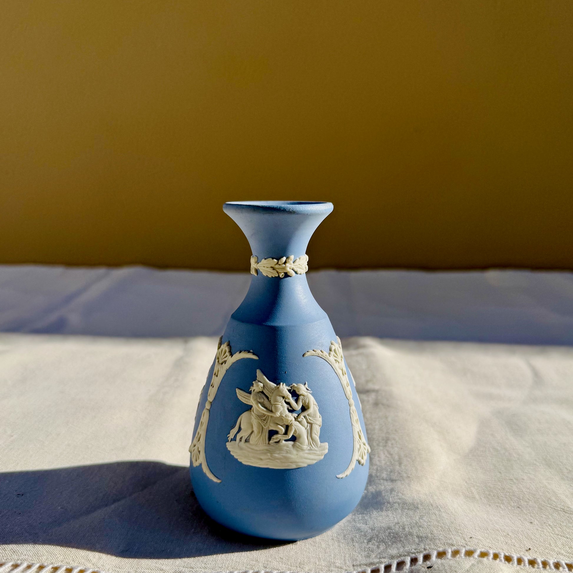 Petit vase porcelaine biscuit Jasperware de Wedgwood, made in England de couleur bleu clair